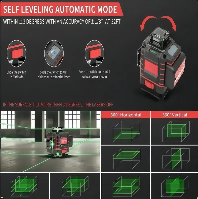Este nivel láser de línea verde para exteriores está diseñado para una alineación y nivelación precisas en una amplia gama de aplicaciones, tanto en interiores como en exteriores. Equipado con líneas láser verdes horizontales y verticales de alta visibilidad, proporciona líneas de referencia claras y precisas, incluso en entornos con mucha luz, lo que lo hace ideal para trabajos de construcción, renovación y jardinería. Características principales Líneas láser verdes de alta visibilidad para uso en exteriores y con mucha luz Proyección de líneas horizontales y verticales para una alineación versátil Calibración automática de autonivelación para una mayor precisión Diseño ergonómico del mango para facilitar su transporte e instalación Ideal para aplicaciones de construcción, renovación y jardinería Población/situaciones aplicables Profesionales de la construcción y renovación Profesionales del bricolaje y la mejora del hogar Alineación de jardinería y paisajismo Tareas de nivelación en interiores y exteriores