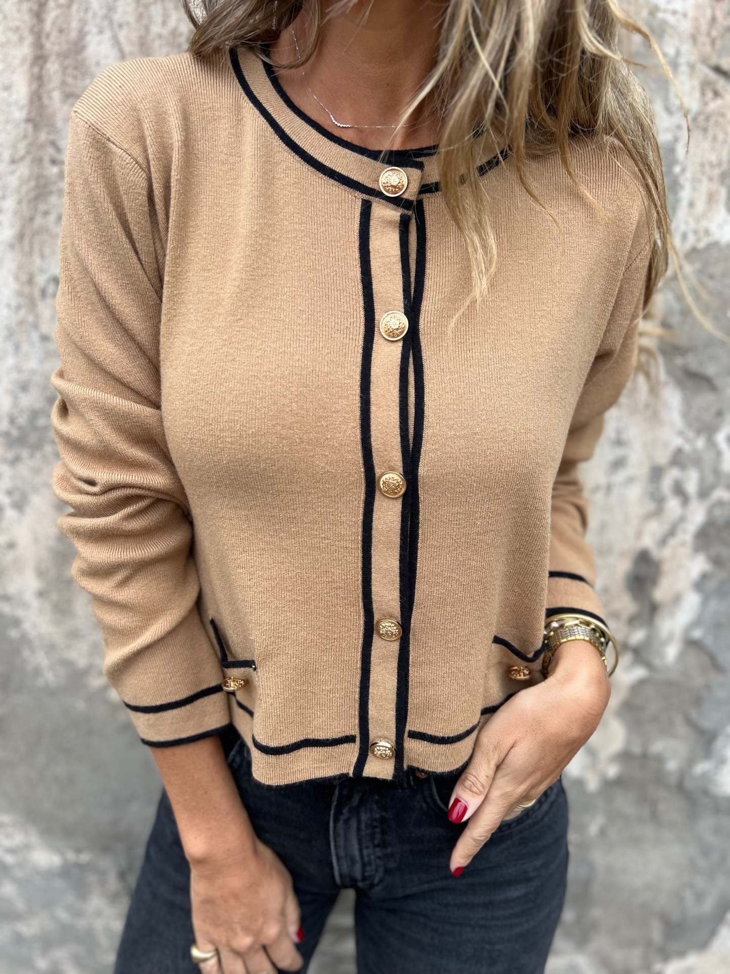 Chaleco de hilo grosor medio muy suave que no pica nada.Elasticado. Botones dorados
